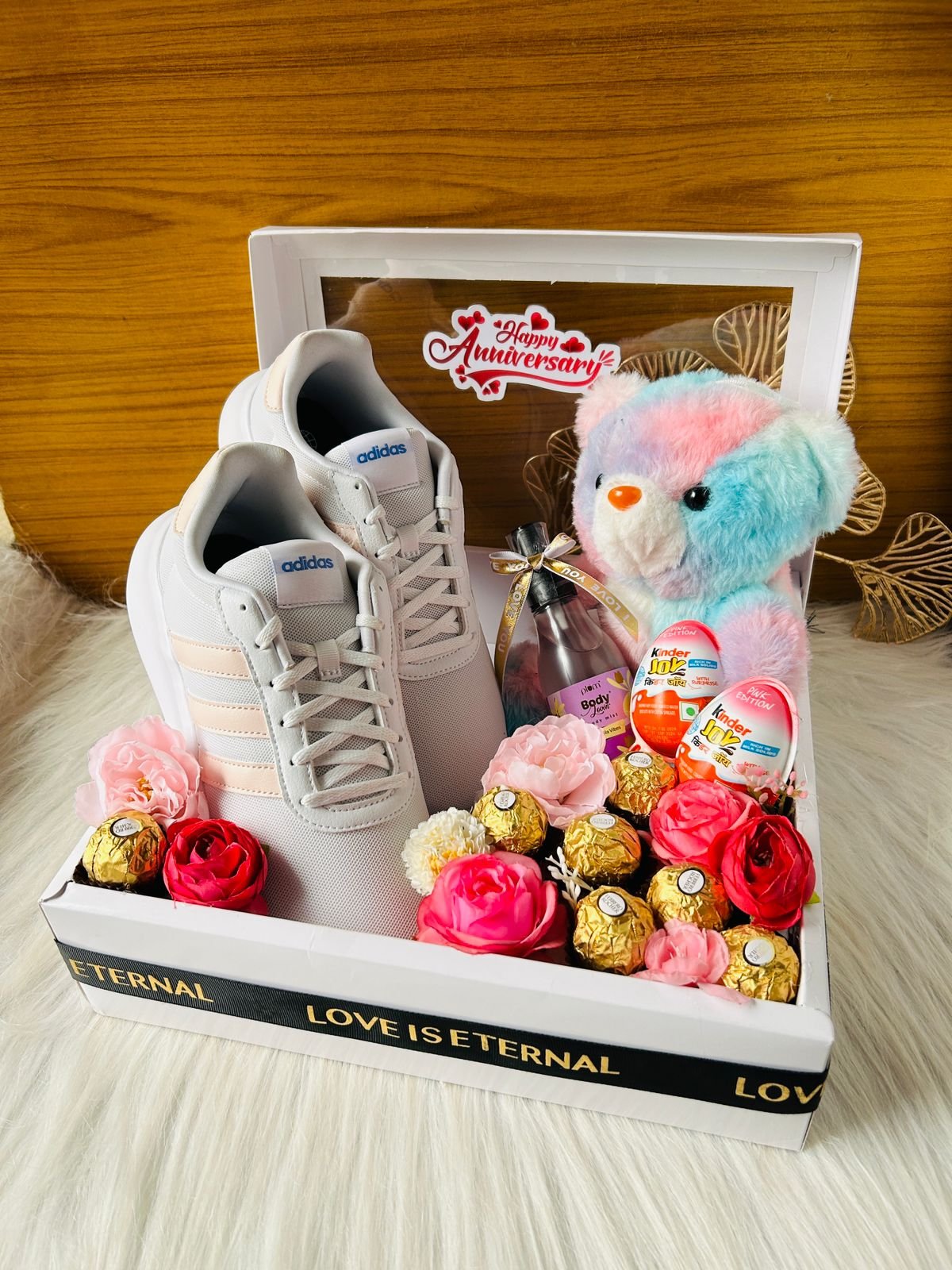 A beautifully curated love hamper featuring stylish footwear, chocolates, fresh florals, and a cuddly teddy — all arranged to celebrate love in every step. Perfect for anniversaries and special surprises, this box is designed to create unforgettable moments