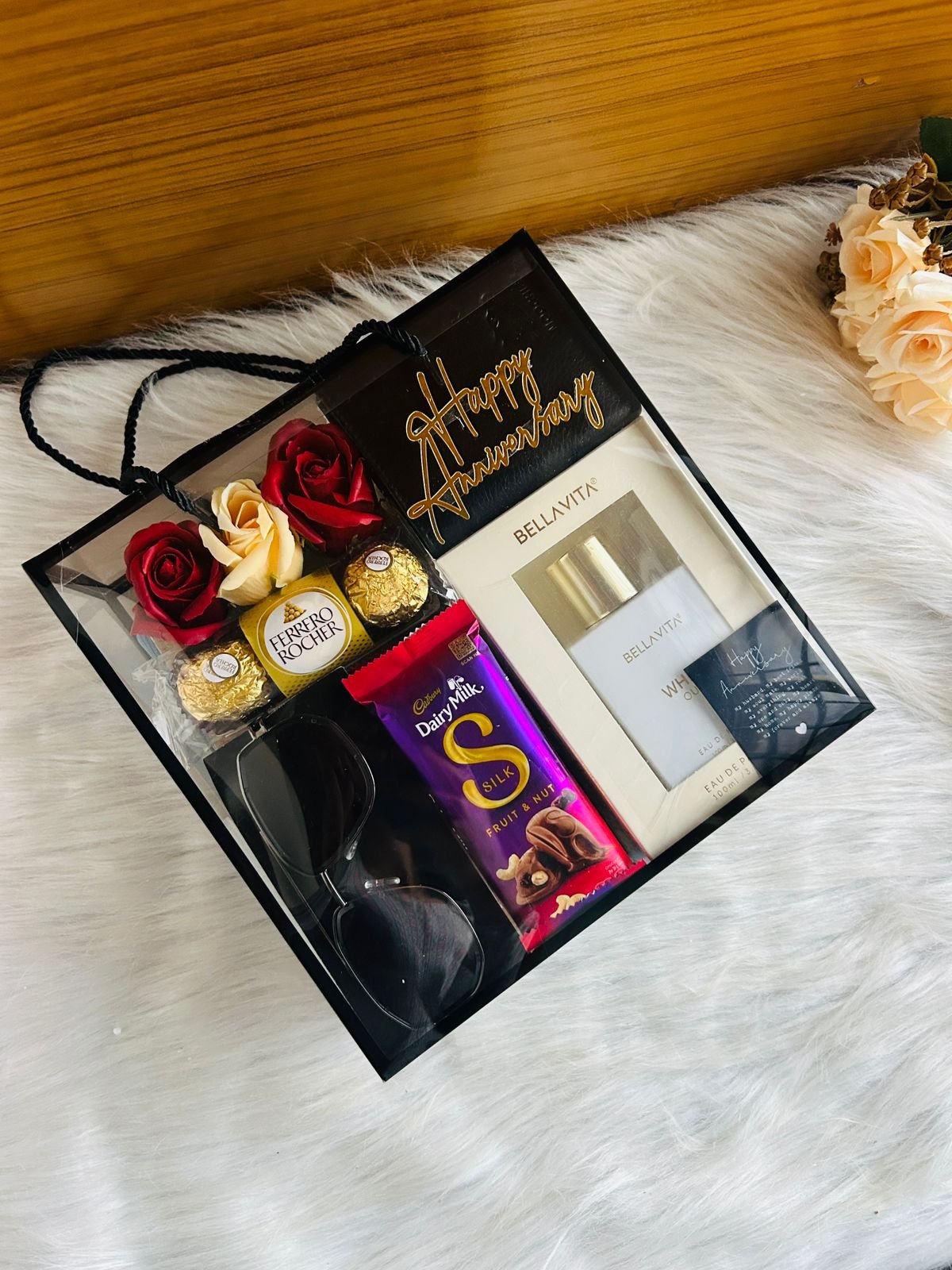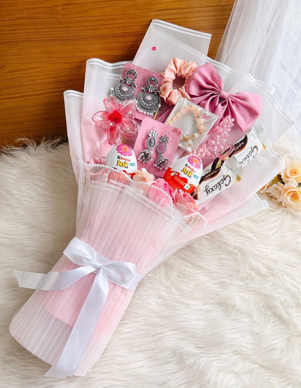 A thoughtfully arranged gift bag with chocolates, flowers, perfume, and accessories — made to surprise and delight your loved one.